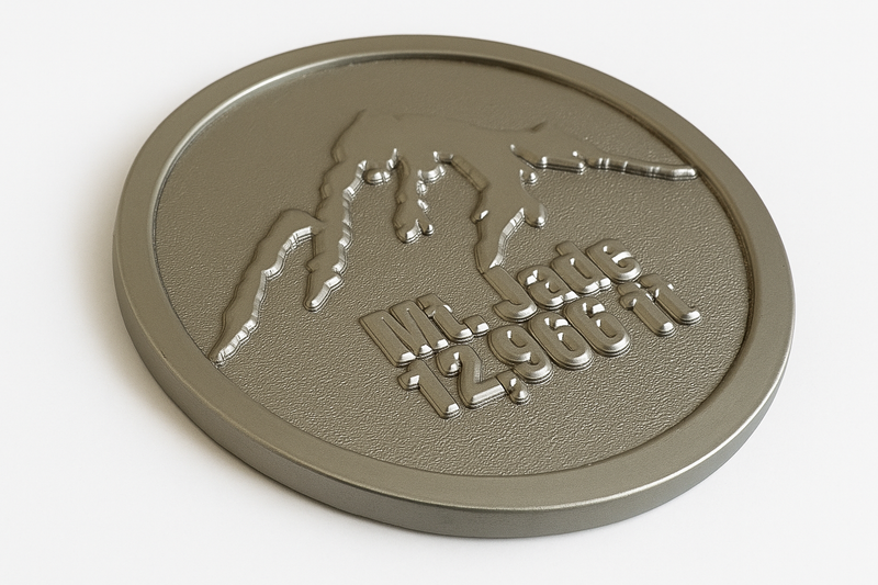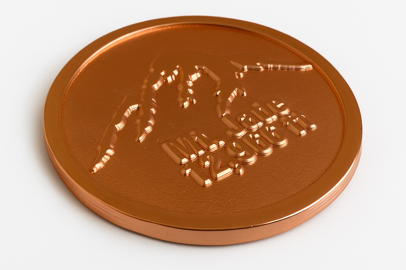 We primarily use brass and copper for stamped coins, offering a traditional appearance. We occasionally use die casted zinc for intricate designs to achieve exceptional detail.