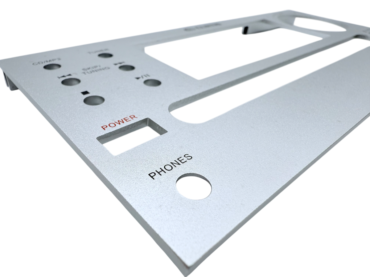 Formed aluminum front panel with surface printed legends and machined cutouts for control layout and spacing.