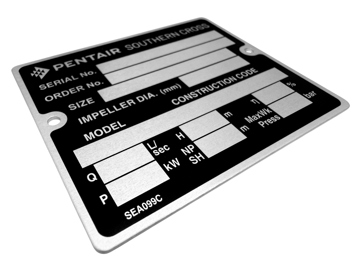 Printed aluminum nameplate for permanent equipment identification and long-term legibility.